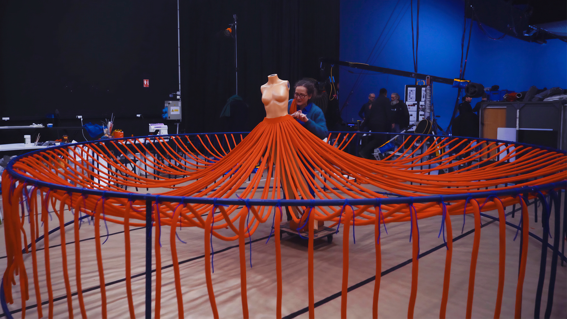 Other elements include an hourglass-shaped chair representing time spent in airport lounges and a layered skirt representing the airline’s network of destinations.